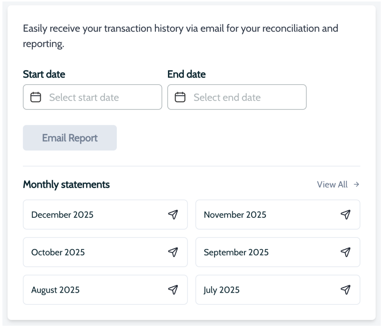 In your Settings, you can generate reports by a specific date range or select a prior month and it will be emailed to you!