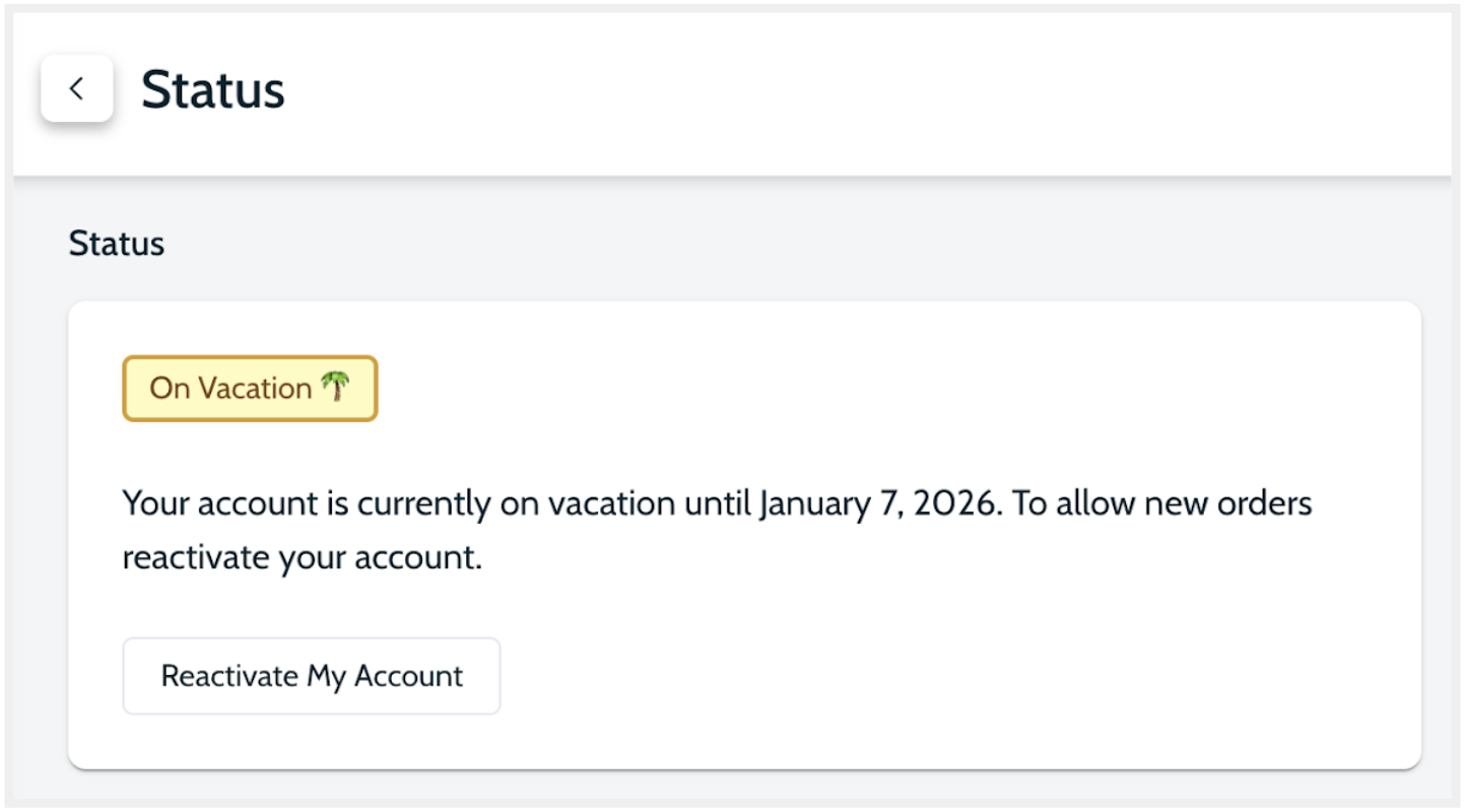 Set your account on Vacation Mode when necessary, all on your own. Select a start and end date. Your inventory will be removed from sales channels on the start date, and automatically reinstated on the end date! You can also request another staff member to be trained so that you never have to use this feature (or miss out on sales) again.