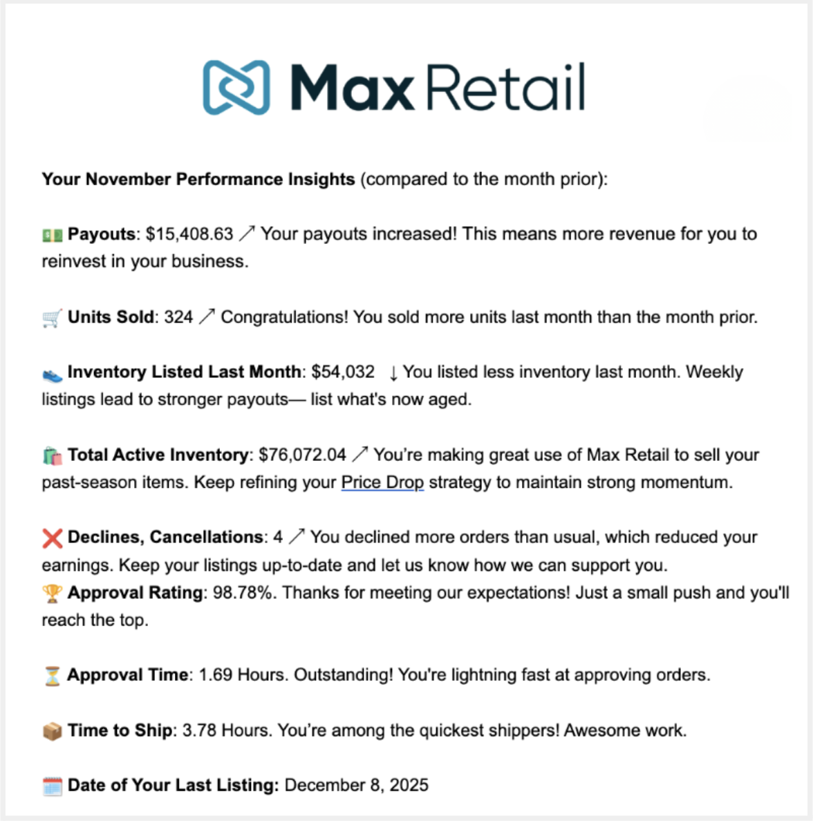 Each month, we send a Performance Report that compares your current results to the prior month. It highlights how your inventory is moving, key sales and payout metrics, listing activity, and fulfillment performance.