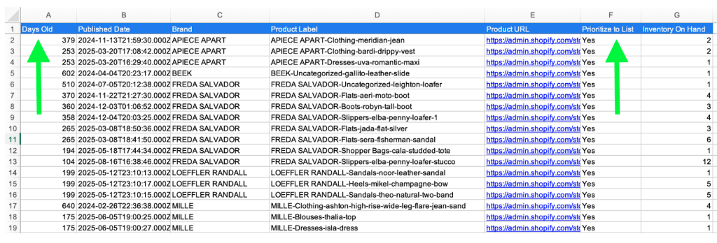 We send a simple, personalized report highlighting aged inventory (90+ days in your store) that isn’t tagged for Max Retail yet. The report flags priority brands and links directly to product pages, making it easy to identify what to list, easily tag and sell.